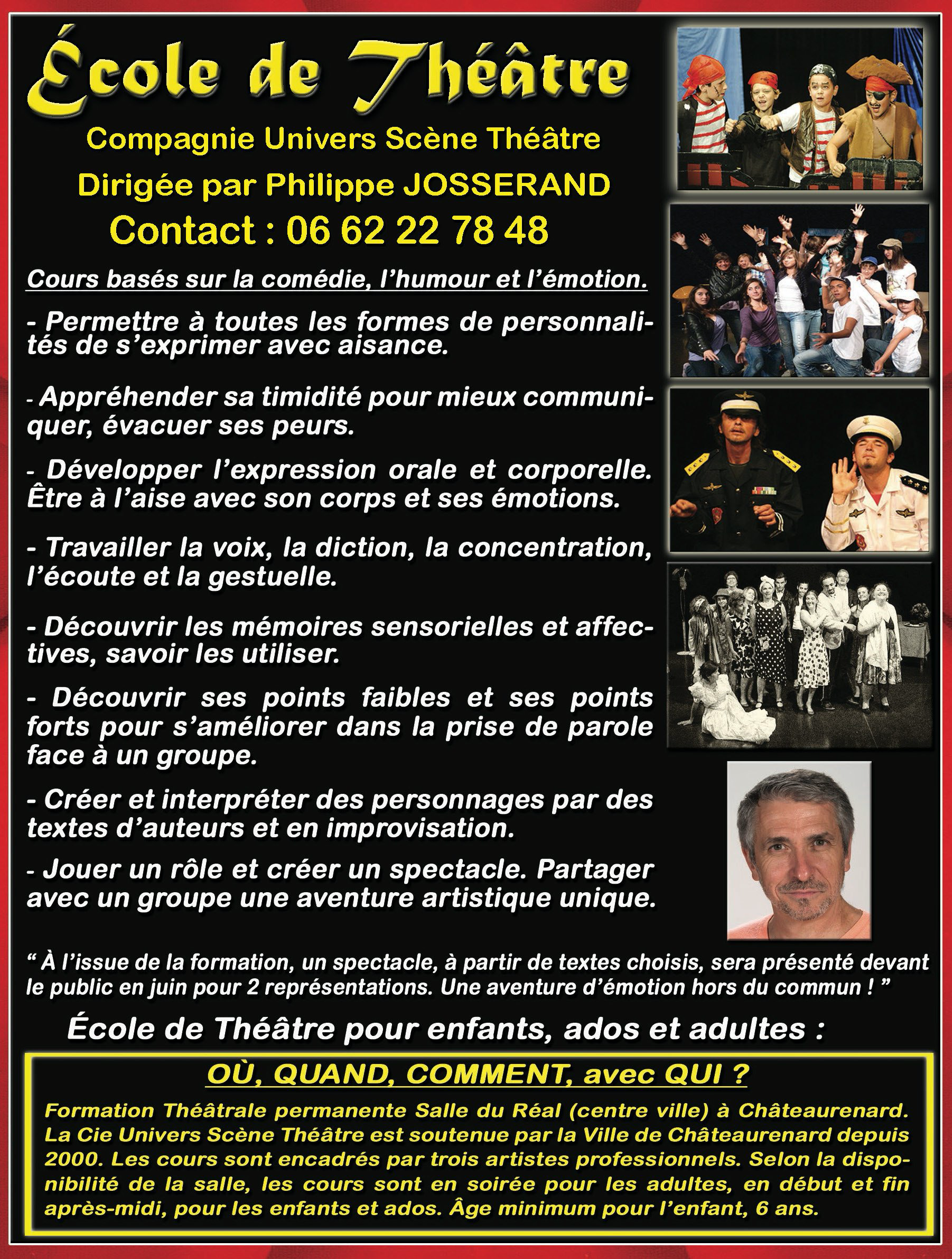 Venez nous retrouver à l'école de Théâtre de la Compagnie Univers Scène Théâtre à Châteaurenard avec un cours d'essai offert, lieu : salle du Réal à Châteaurenard - Avenue Roger Salengro.